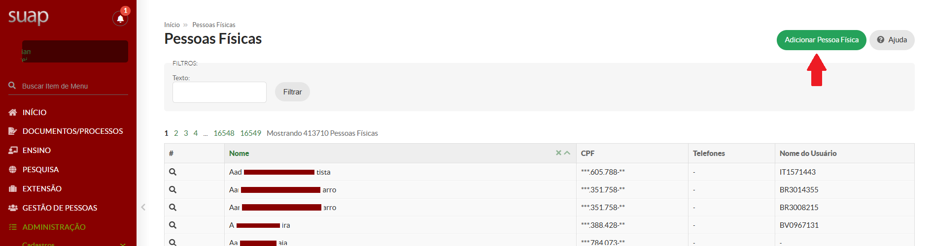1º. Acesse Início -> Administração -> Cadastro -> Pessoas Físicas