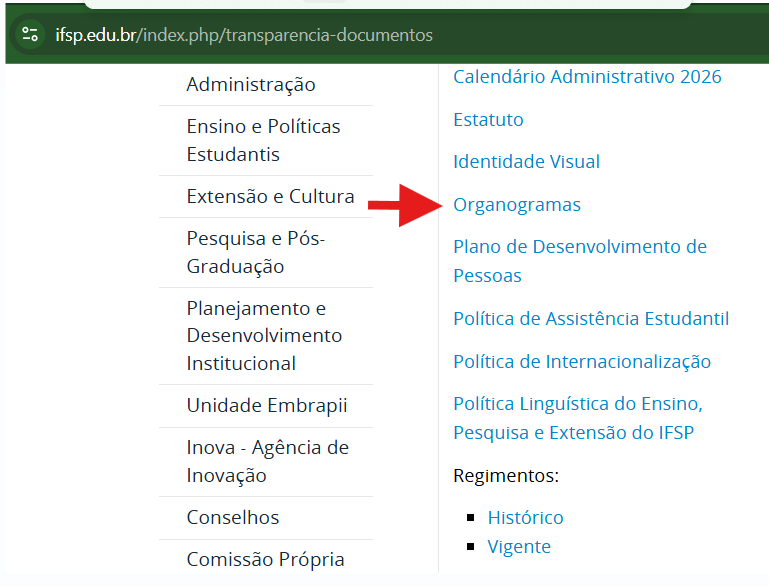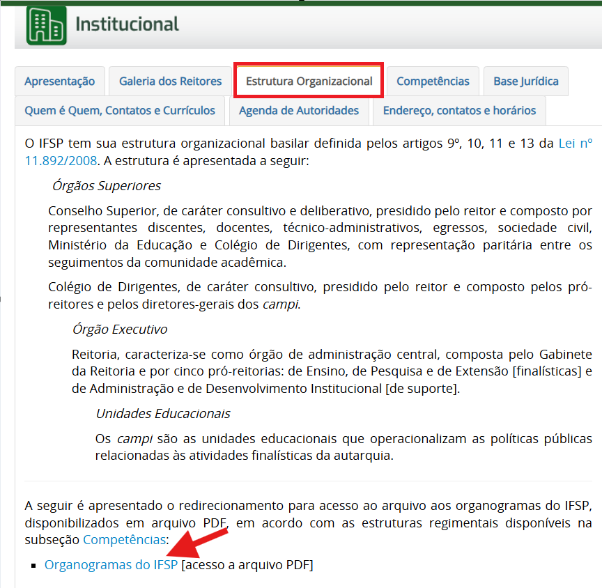 2. Página inicial > Transparência e Prestação de Contas > IFSP > Reitoria > Reitoria - Destaques > Institucional > Aba Estrutura Organizacional.