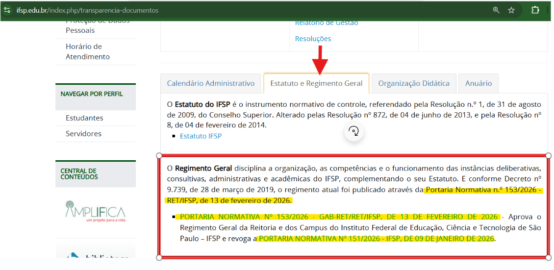 2. Página Transparência > Documentos Institucionais > Aba Estatuto e Regimento Geral - atualizar o texto e o link de acesso ao arquivo da portarial atual.