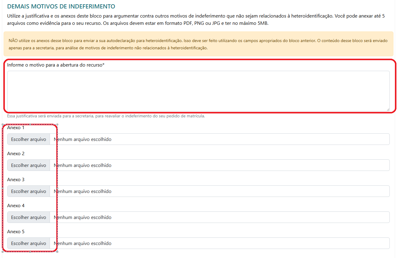 Assim, caso a justificativa do indeferimento inclua outros fatores além da heteroidentificação, o candidato deverá registrar o recurso no campo indicado e poderá anexar até cinco arquivos de documentos para complementar a solicitação.