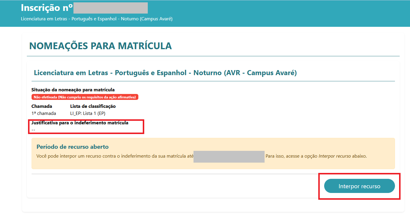 A pessoa candidata deverá obrigatoriamente redigir a justificativa do recurso contra o indeferimento da matrícula.