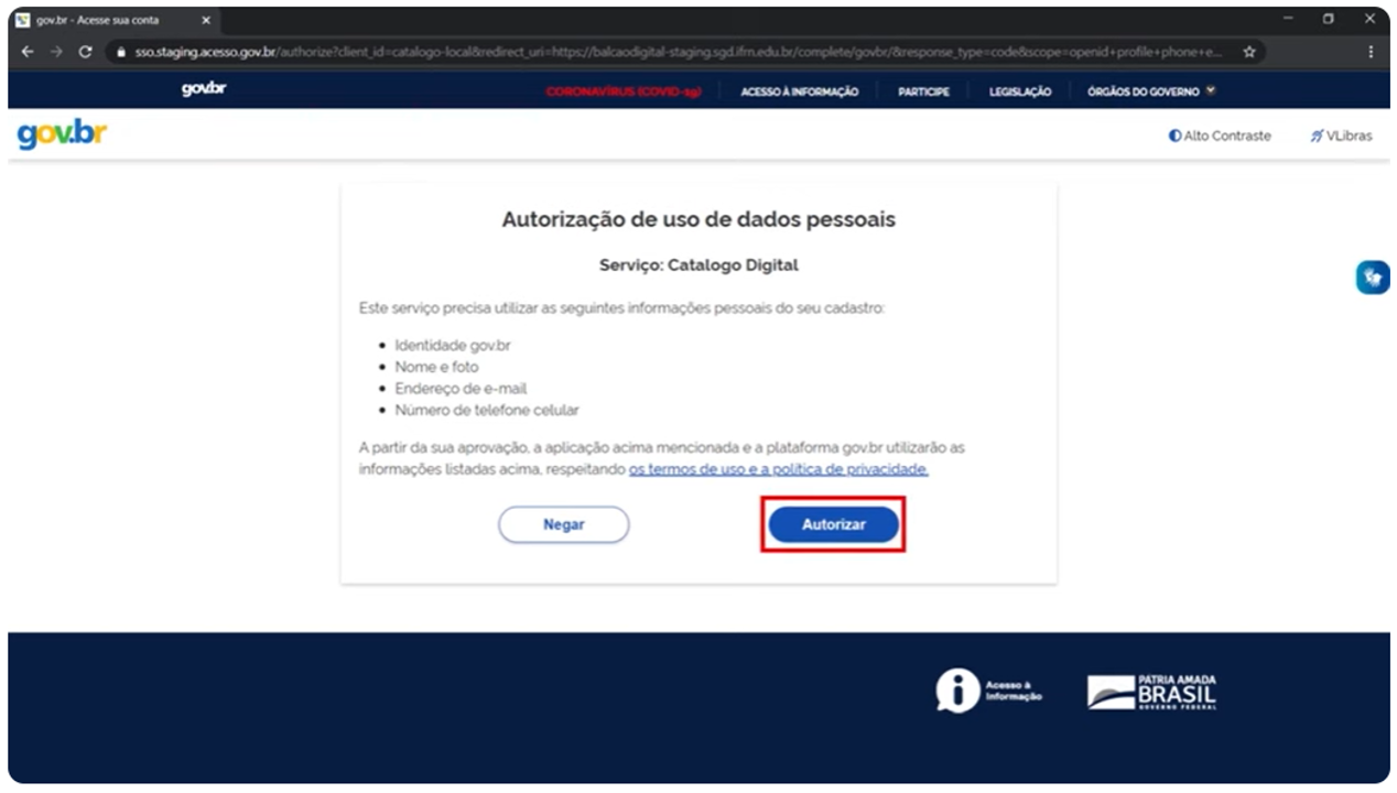 Na página seguinte, o candidato deverá permitir o uso de dados pessoais para a realização da matrícula - clique em Autorizar: