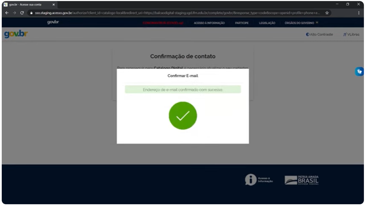 O sistema indicará a confirmação do número de celular ou da conta de e-mail: