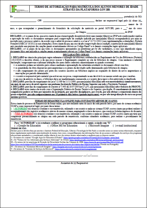 (6) Autorização do Responsável: o responsável legal do estudante deve ler atentamente este documento, preenchendo seus dados, além de: