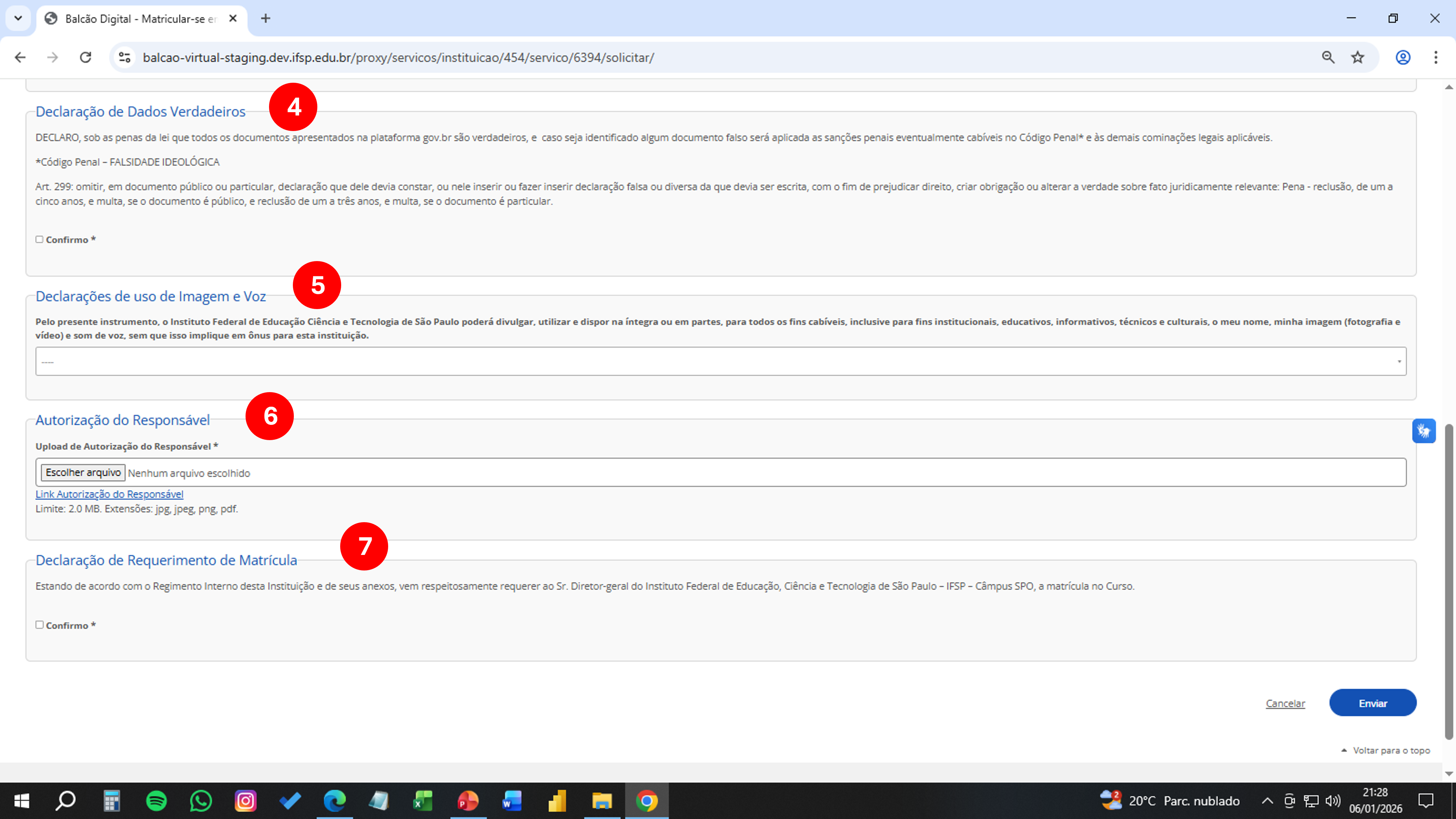 (7) Declaração de Requerimento de Matrícula: Concordância quanto ao Regimento Interno do IFSP e confirmação da requisição de matrícula no curso em que foi aprovado em processo seletivo.