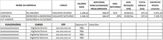 relação dos empregados, contendo nome completo, cargo ou função, horário do posto de trabalho, números da carteira de identidade (RG) e da inscrição no Cadastro de Pessoas Físicas (CPF), com indicação dos responsáveis técnicos pela execução dos serviços, quando for o caso;