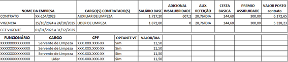 Para facilitar a conferencia da documentação, aconselha-se a utilização de uma planilha onde conste todas de informações básicas do contrato como nome do(s) funcionário(s), CPF, salários, adicionais, benefícios, valor do posto, e outras informações que se julguem necessárias. Manter essa planilha atualizada ajudará também no momento do preenchimento da planilha da CGU que deve ser enviada quadrimestralmente, conforme modelo anexo I, deste manual.