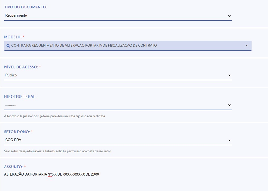 | Substituição de fiscal de contrato | Requerimento | CONTRATO: REQUERIMENTO DE ALTERAÇÃO DE PORTARIA DE FISCALIZAÇÃO DE CONTRATO |