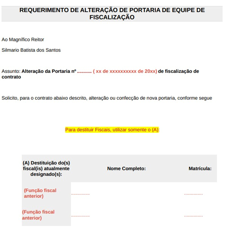 | Destituição ou inclusão de fiscal de contrato | Requerimento | CONTRATO: REQUERIMENTO DE ALTERAÇÃO DE PORTARIA DE FISCALIZAÇÃO DE CONTRATO |