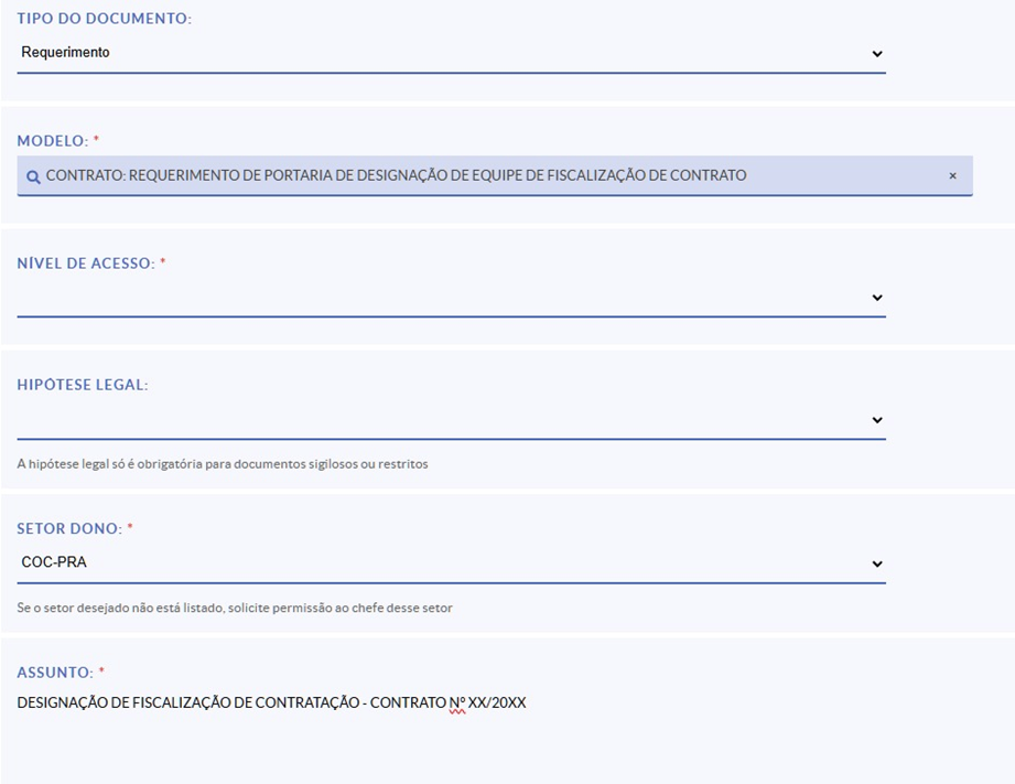 | Designação de fiscais de novo contrato | Requerimento | CONTRATO: REQUERIMENTO DE PORTARIA DE DESGINAÇÃO DE EQUIPE DE FISCALIZAÇÃO DE CONTRATO |