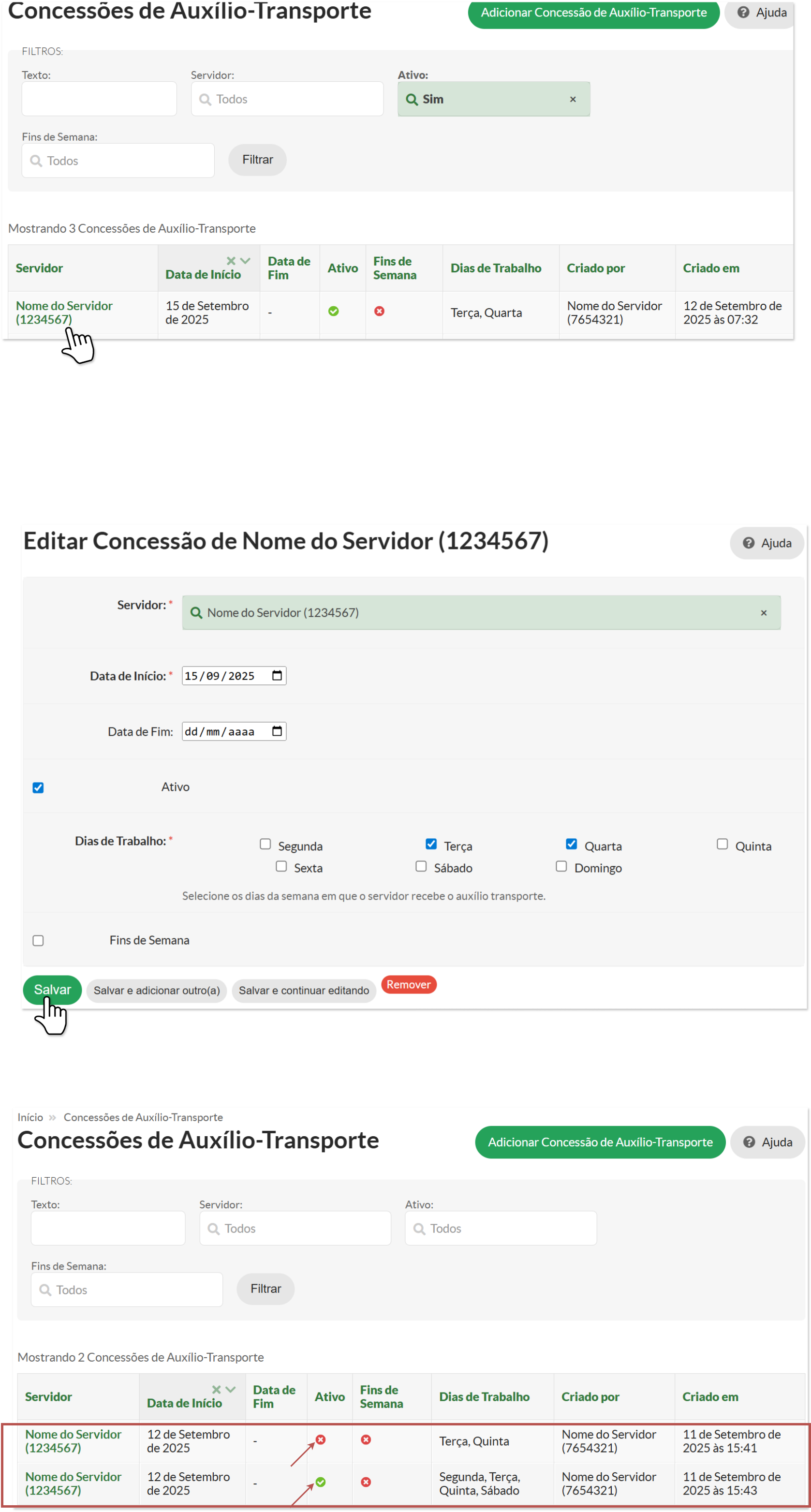 A edição de uma concessão invalida automaticamente o registro anterior e gera um novo registro atualizado, preservando o histórico completo. Assim, todas as versões permanecem disponíveis para consulta, garantindo a rastreabilidade das alterações realizadas.