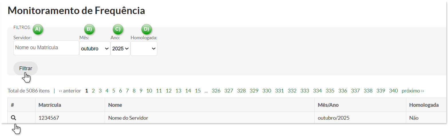 - Após localizar a folha desejada, clique no ícone de lupa para acessar a tela de frequência correspondente.