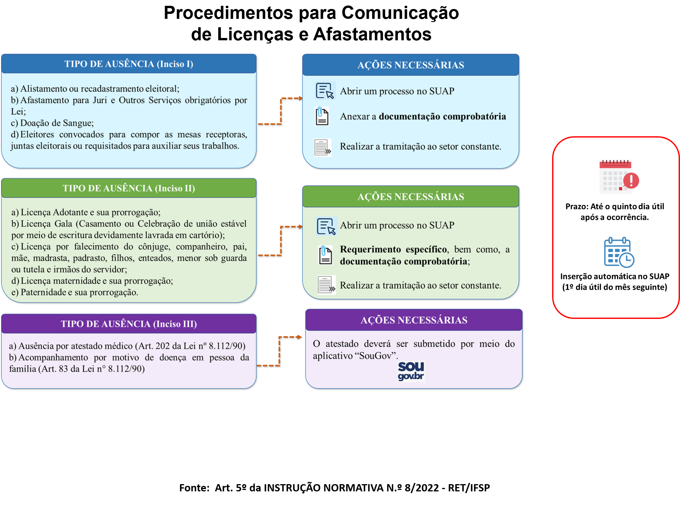 Os tipos de afastamentos a serem informados estão listados no Art. 5º da INSTRUÇÃO NORMATIVA N.º 8/2022 - RET/IFSP, transcrito abaixo: Art. 5º As licenças e afastamentos listados neste artigo serão inseridos automaticamente no ponto eletrônico do Suap no primeiro dia útil do mês seguinte ao da ocorrência, desde que haja o processamento do afastamento no SIAPE.