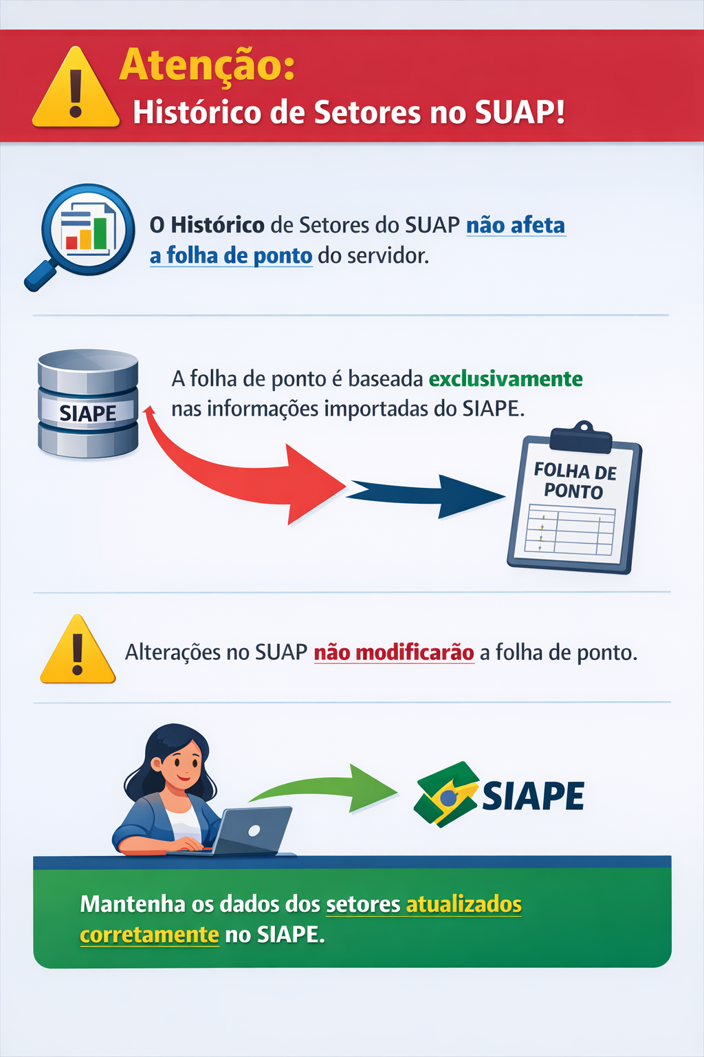 O fato da informação no Histórico de Setores do SUAP estar incorreta não impacta na folha de ponto do servidor, visto que a módulo do ponto se baseia, apenas, na informação que é importada do SIAPE, ou seja, alterando informações no Histórico de Setores de um determinado servidor não irá refletir mudanças em sua folha de ponto. Devido esse fato, é importante que os dados referente a setores dos servidores estejam devidamente corretos no SIAPE.