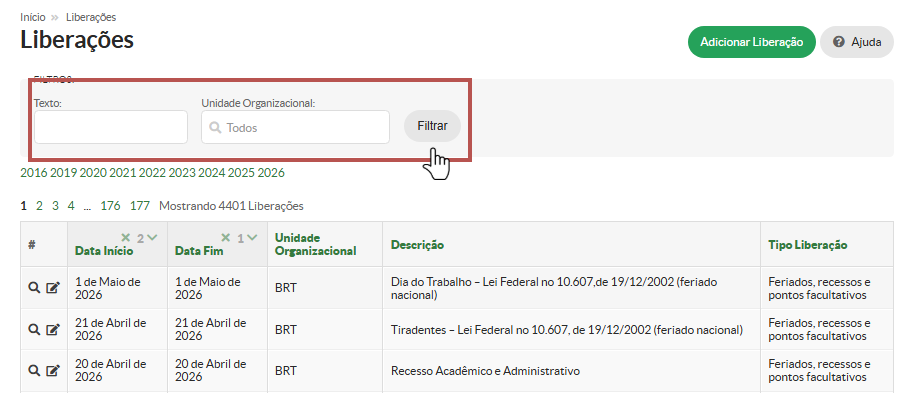 - Na página, será possível acompanhar todas as liberações já cadastradas para o campus.