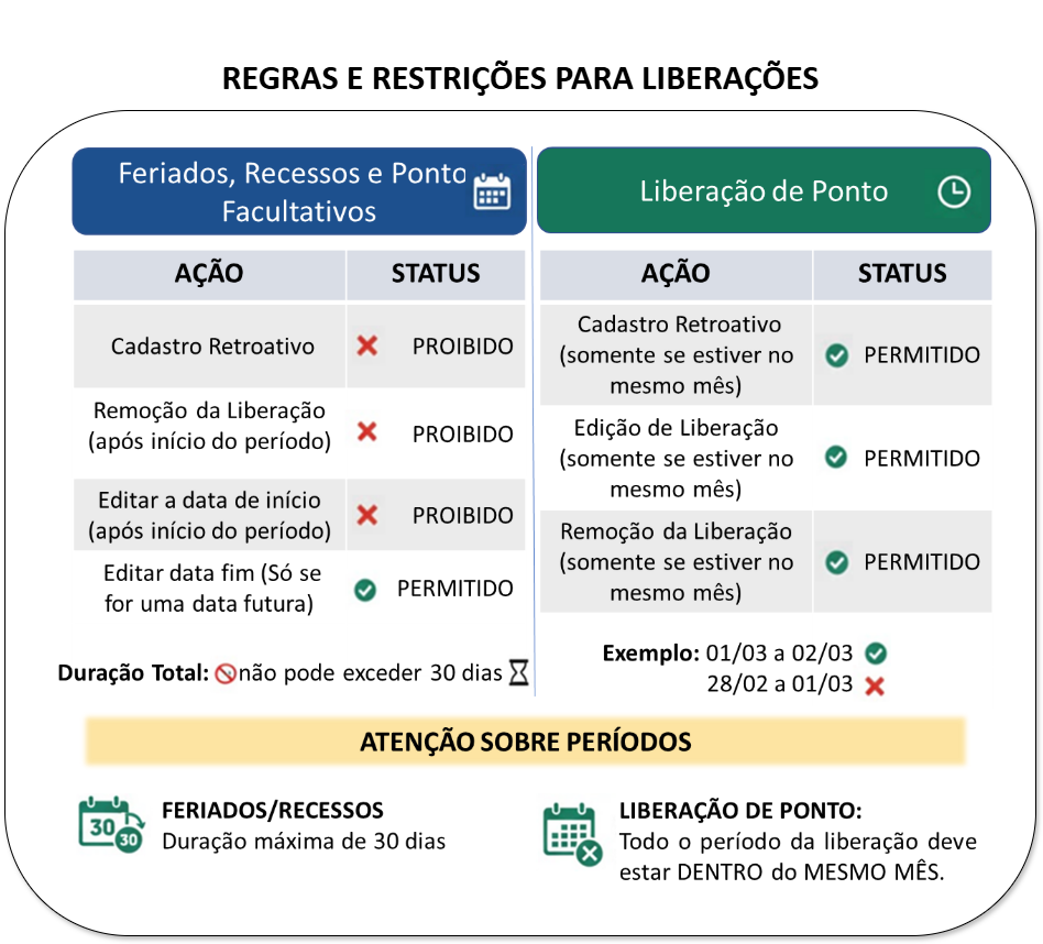 Não é permitido o cadastro retroativo;Não é permitida a remoção da liberação se o período de liberação já tiver sido iniciado;Não é permitido editar a data de início se o período de liberação já tiver sido iniciado;A data fim só pode ser editada se ela é uma data futura;O período total de liberação não pode exceder 30 dias.