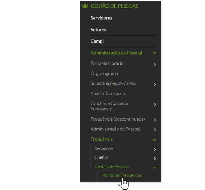 - No menu lateral, selecione: GESTÃO DE PESSOAS → Administração de Pessoal → Frequência → Gestão de Pessoas → Monitorar Frequências.