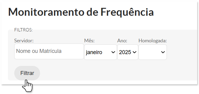 Para consultar as informações de frequência de um servidor, utilize a área de filtros conforme indicado na tela. Preencha os seguintes campos: