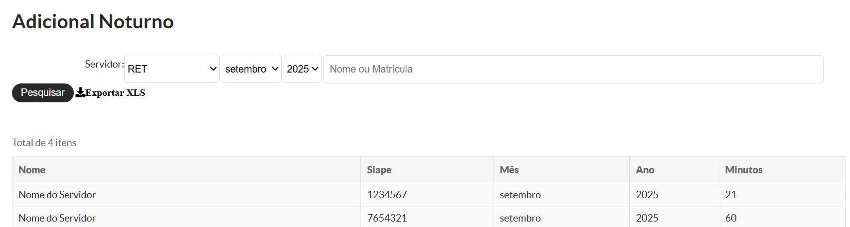 Após a realização da pesquisa, o sistema exibirá o Relatório de Adicional Noturno com as informações dos servidores correspondentes ao mês e ao ano selecionados, apresentando o quantitativo de adicional noturno apurado em minutos, conforme demonstrado na imagem abaixo.