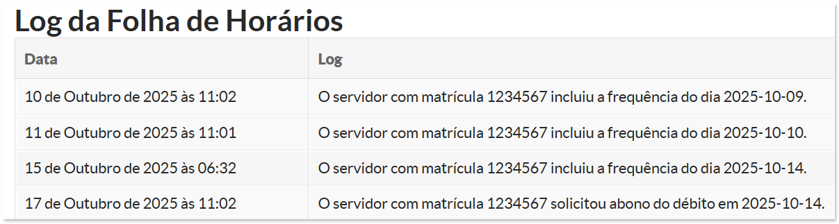 | Débito Pendente | Informa se existem débitos ainda não compensados/abonados. Caso esteja como "0h00m", significa que o servidor não possui débitos pendentes para o mês. |