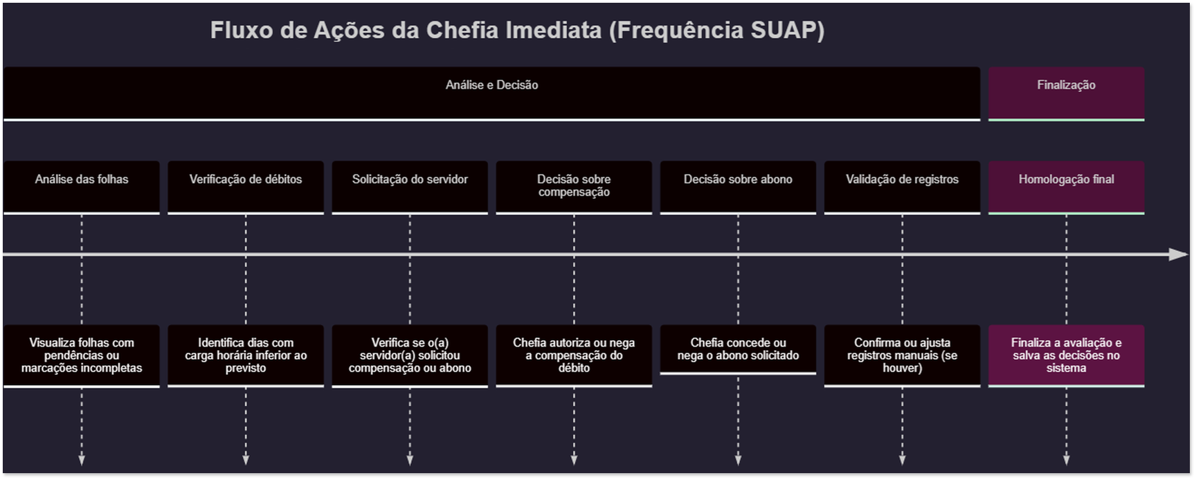 A chefia deve verificar todas as frequências antes de homologar a folha, pois a ausência de registros não é automaticamente identificada pelo sistema. Em caso de inércia da chefia, o sistema manterá os registros informados pelo servidor.