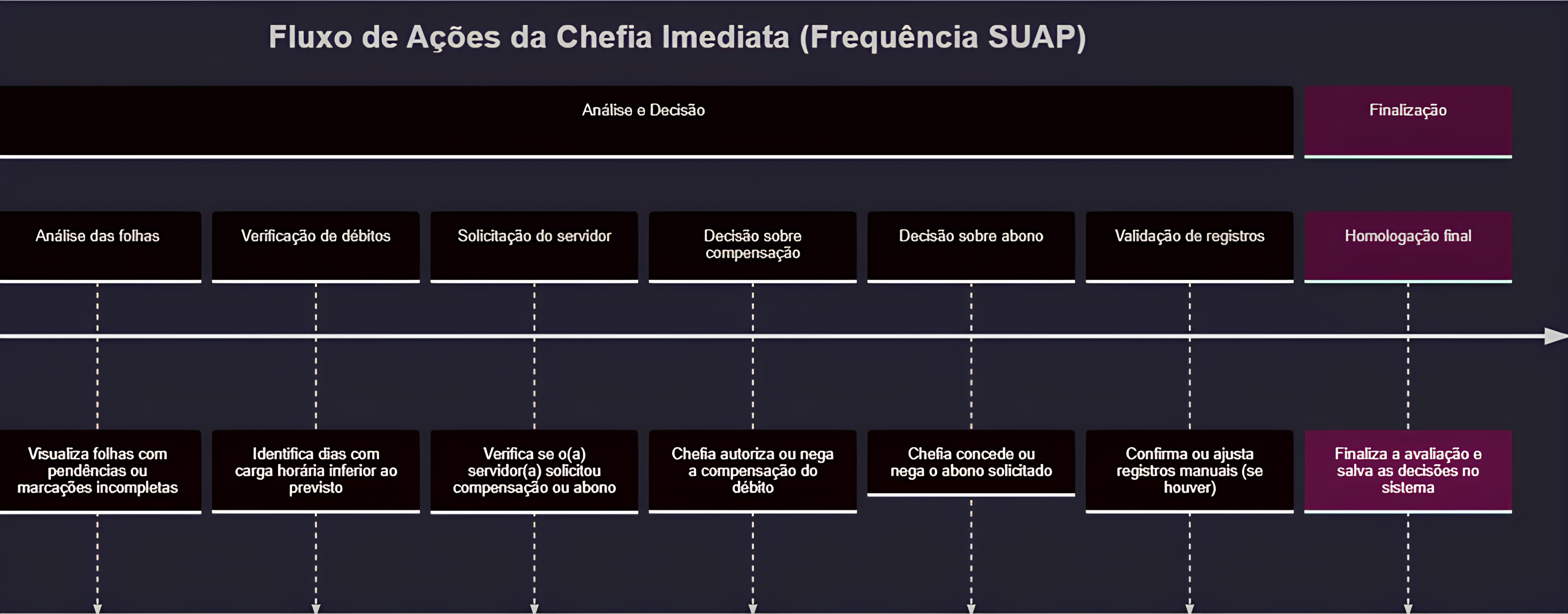 A chefia deve verificar todas as frequências antes de homologar a folha, pois a ausência de registros não é automaticamente identificada pelo sistema. Em caso de inércia da chefia, o sistema manterá os registros informados pelo servidor.
