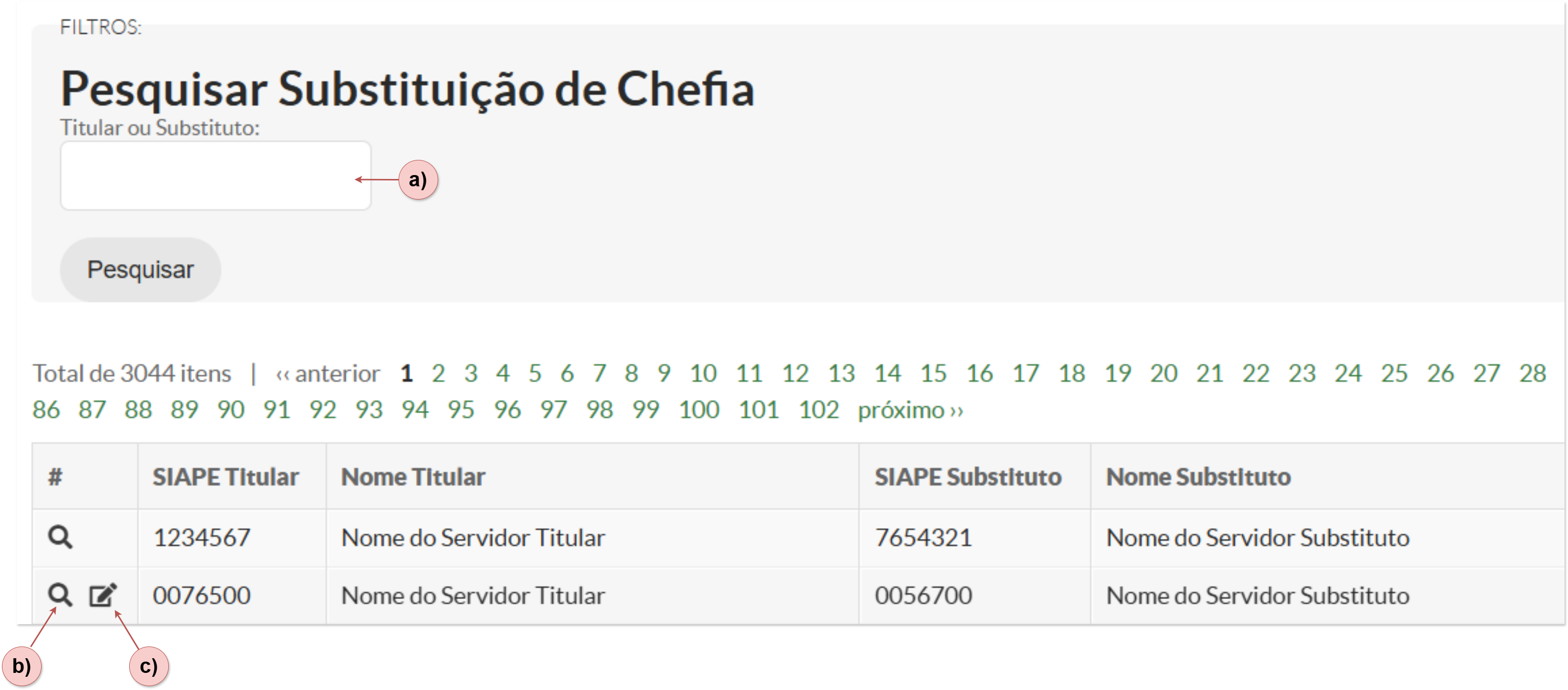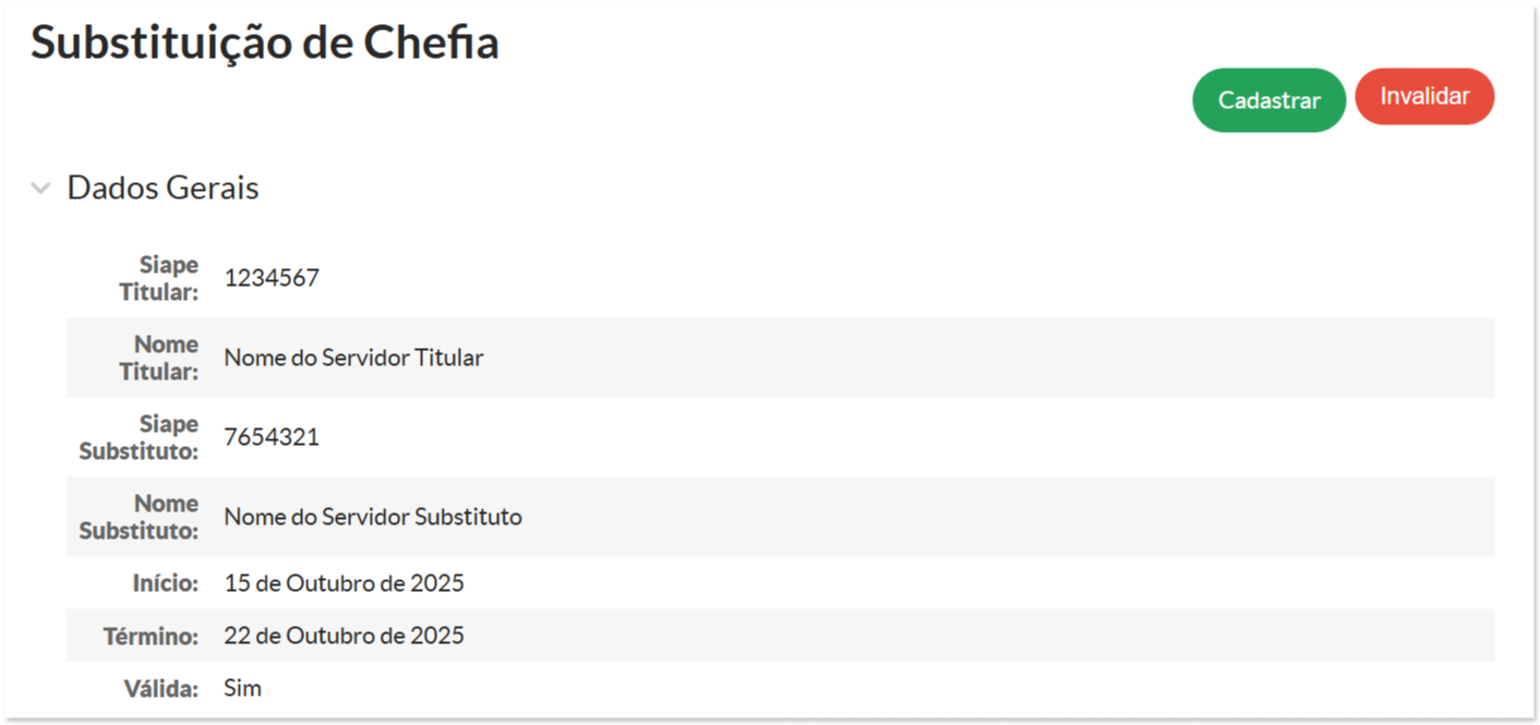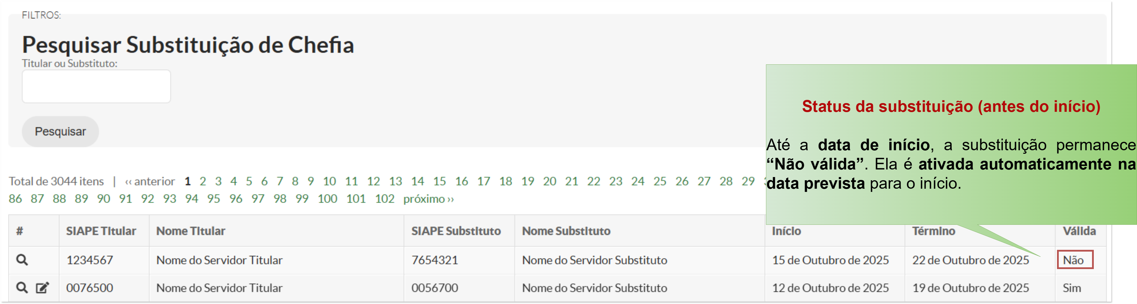 A CGP, em caso de impossibilidade da chefia fazê-lo, terá acesso para realizar o cadastro de substituições.
