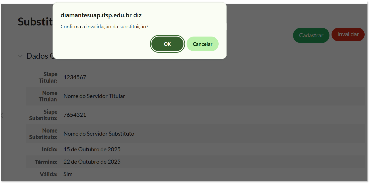 A seguinte tela será exibida com o resumo das informações. Clique no botão "Cadastrar" para inserir uma nova substituição.