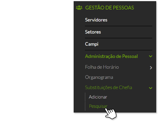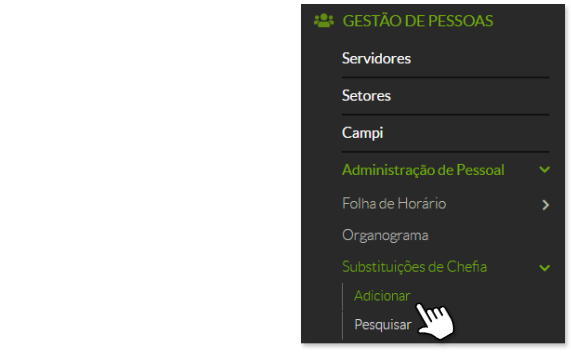 - No menu lateral, selecione: Gestão de Pessoas > Administração de Pessoal > Substituições de Chefia > Adicionar
