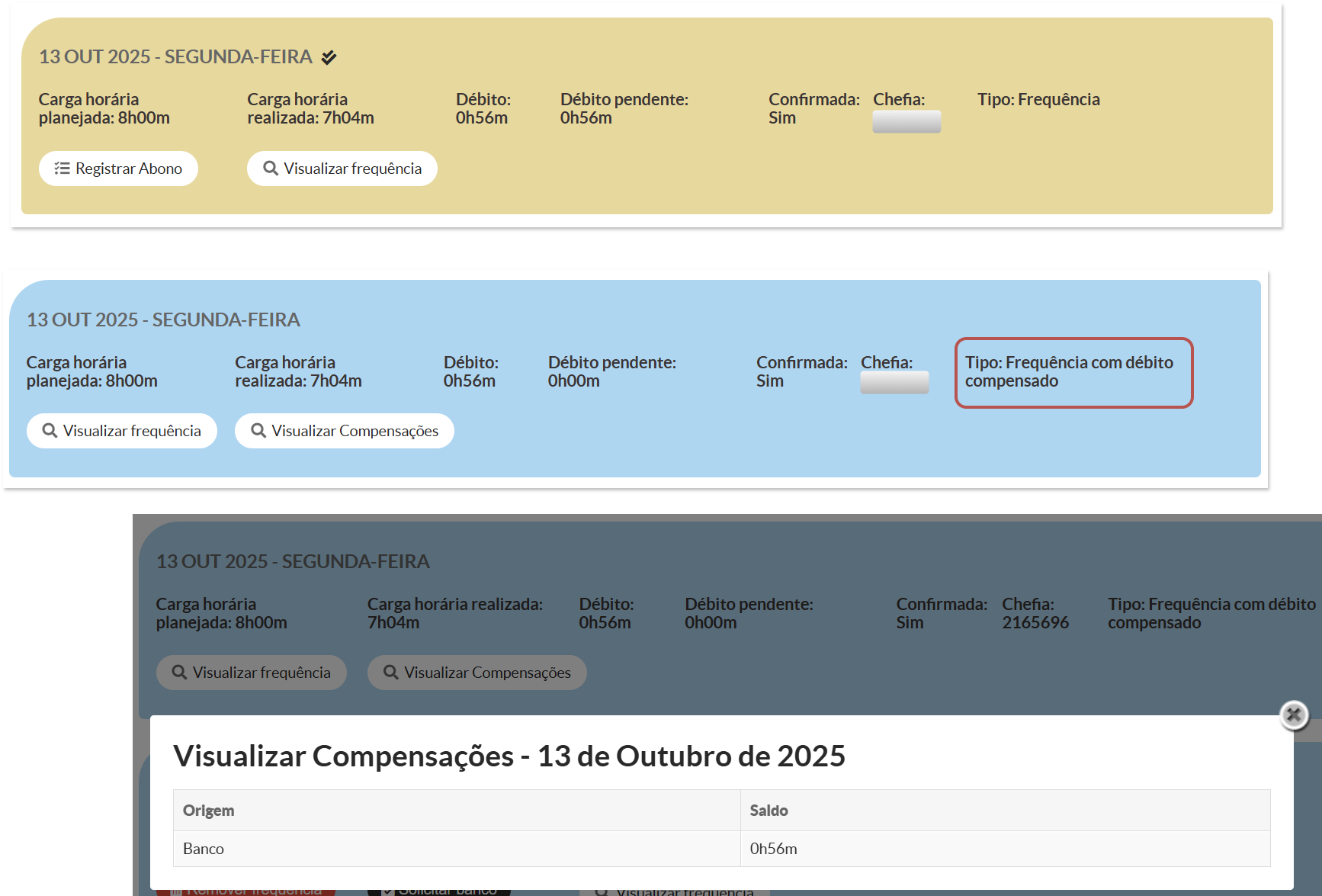 Caso a chefia opte por "Negar compensação" o débito permanecerá, e este não poderá ser objeto de compensação futura, no entanto, ainda será possível abonar tal débito.