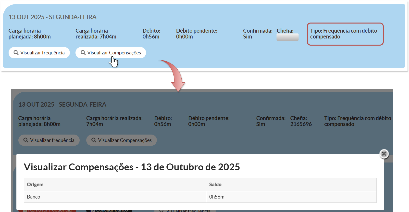 Após a chefia autorizar a compensação, a frequência do(a) servidor(a) ficará aguardando a ação do próprio servidor, que deverá clicar no botão "Compensar Débito".