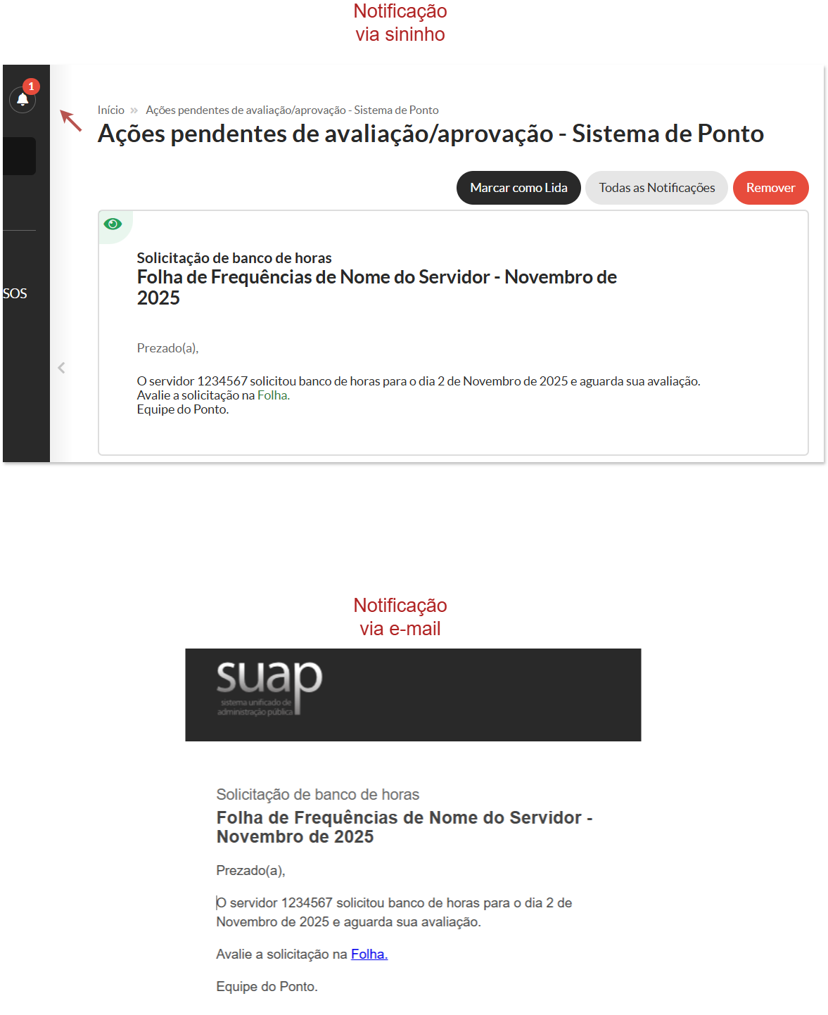 Quando o(a) servidor(a) solicita Banco de Horas, a chefia imediata é automaticamente notificada, tanto por e-mail quanto por alerta no sistema (ícone de notificação). Essas notificações informam que houve uma solicitação pendente de avaliação.