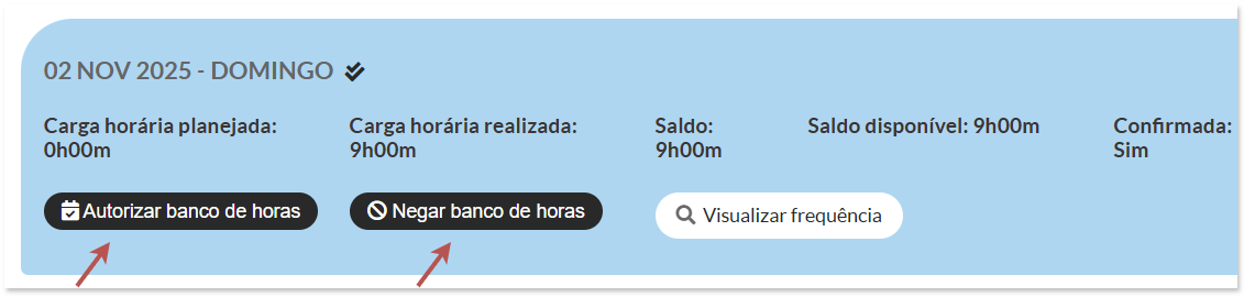 4. Na data com registro de saldo escolha entre as opções de "Autorizar banco de horas" ou "Negar banco de horas".