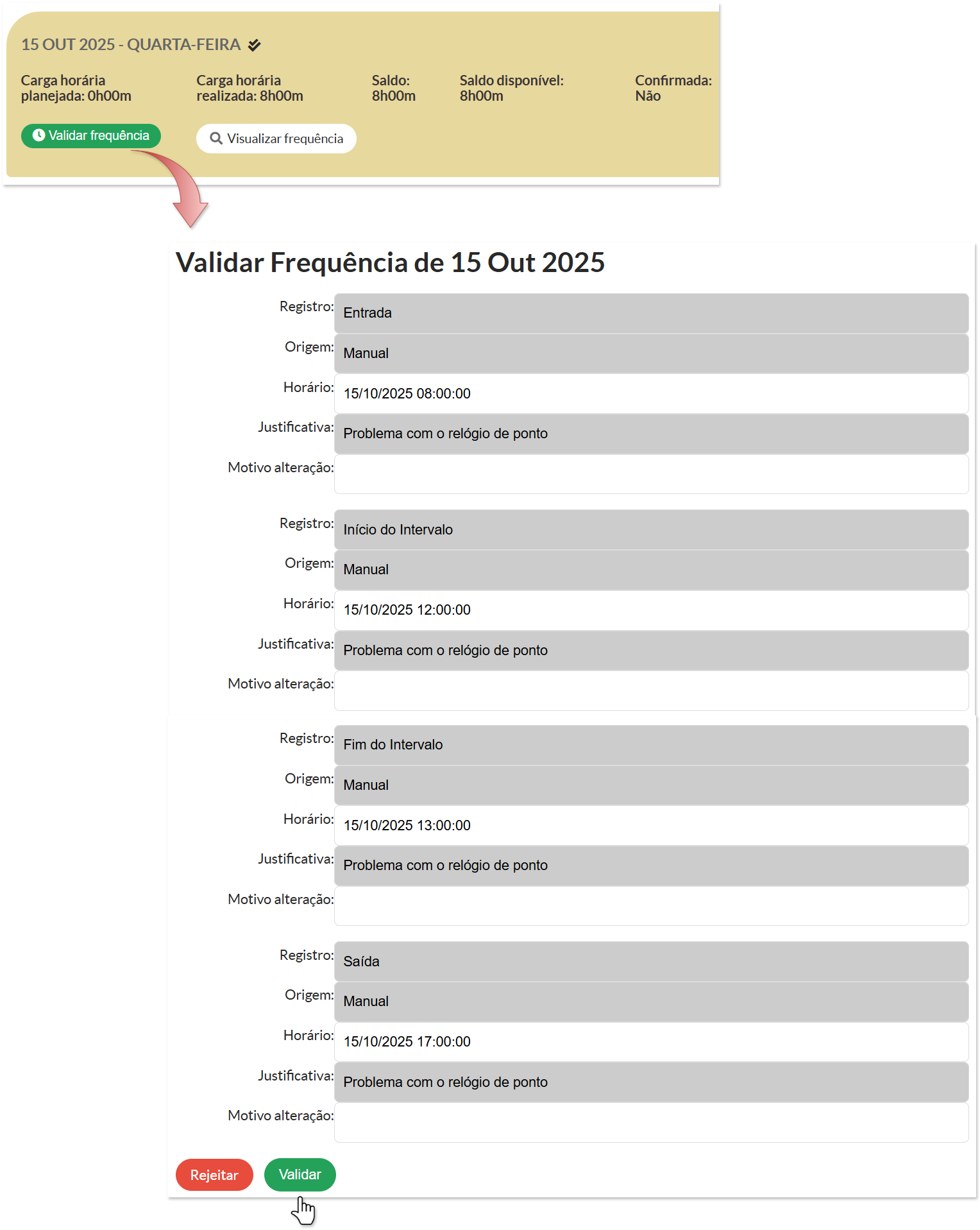Para servidores(as) que realizarem o registro manual da frequência, a chefia deverá validar a frequência utilizando o botão "Validar frequência". Já o botão "Visualizar frequência" permite visualizar os registros e as justificativas informadas pelo(a) servidor(a).