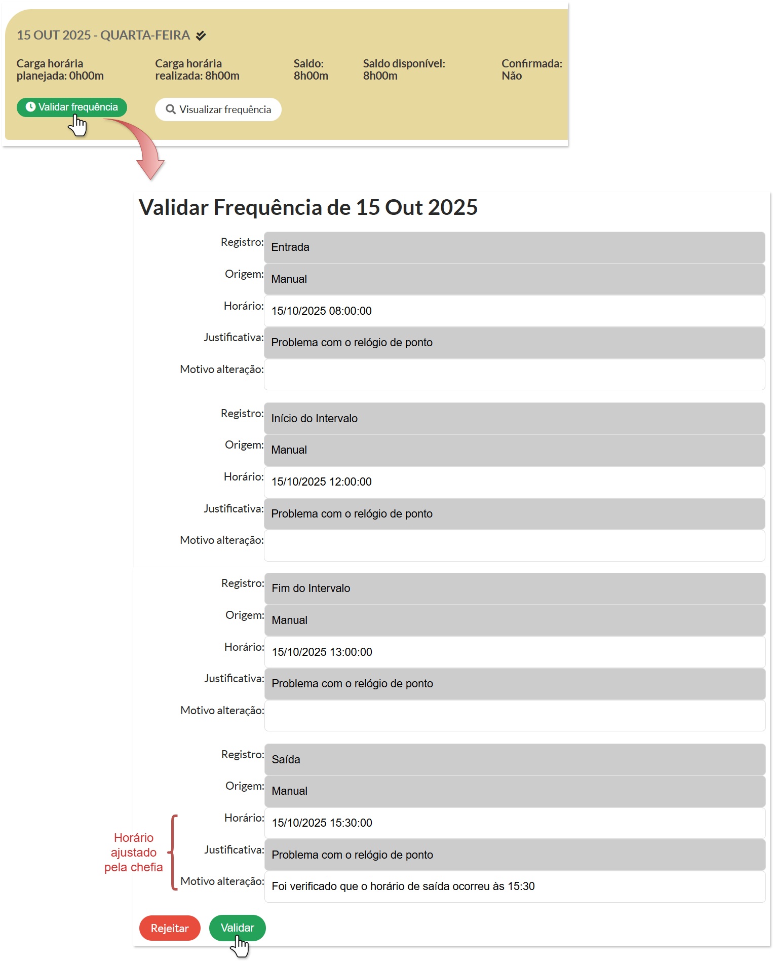 O sistema permite que a chefia imediata rejeite registros manuais de frequência, assegurando maior controle sobre a regularidade das marcações.
