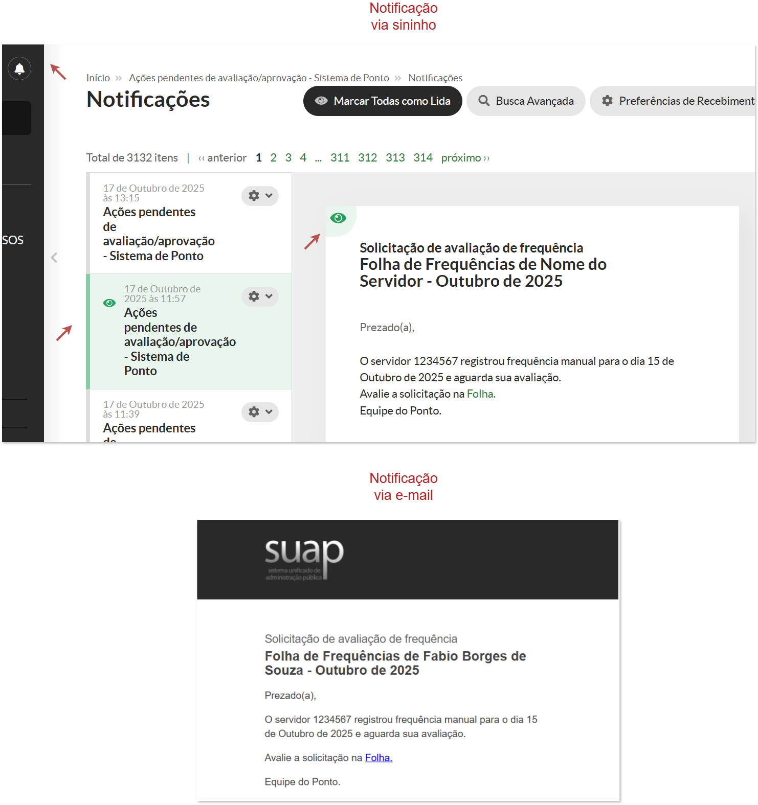 Quando o(a) servidor(a) registra uma frequência manual, a chefia imediata é automaticamente notificada, tanto por e-mail quanto por alerta no sistema (ícone de notificação). Essas notificações informam que houve o envio de um registro manual, pendente de avaliação.
