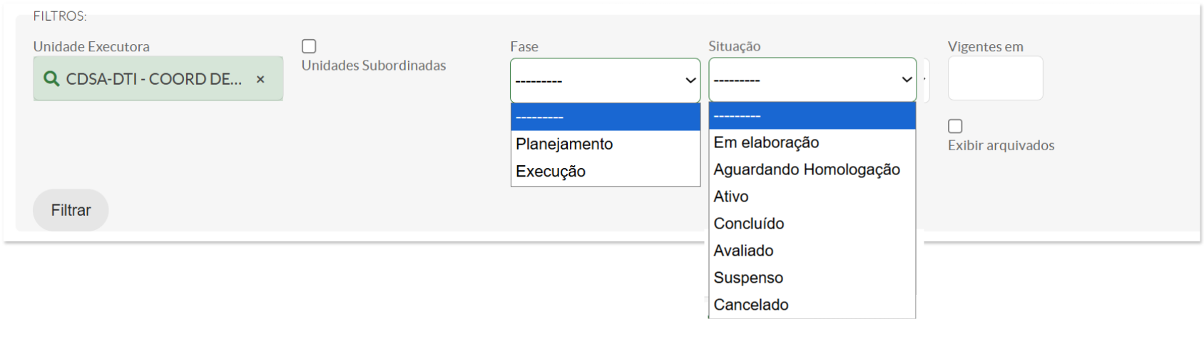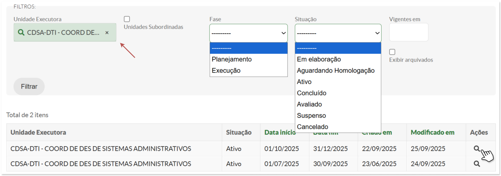 Por padrão, conforme ilustrado na figura abaixo, a listagem é filtrada para exibir apenas os planos da Unidade Executora em que o servidor se encontra em exercício no momento. Para consultar planos de outras unidades, basta utilizar os filtros disponíveis.