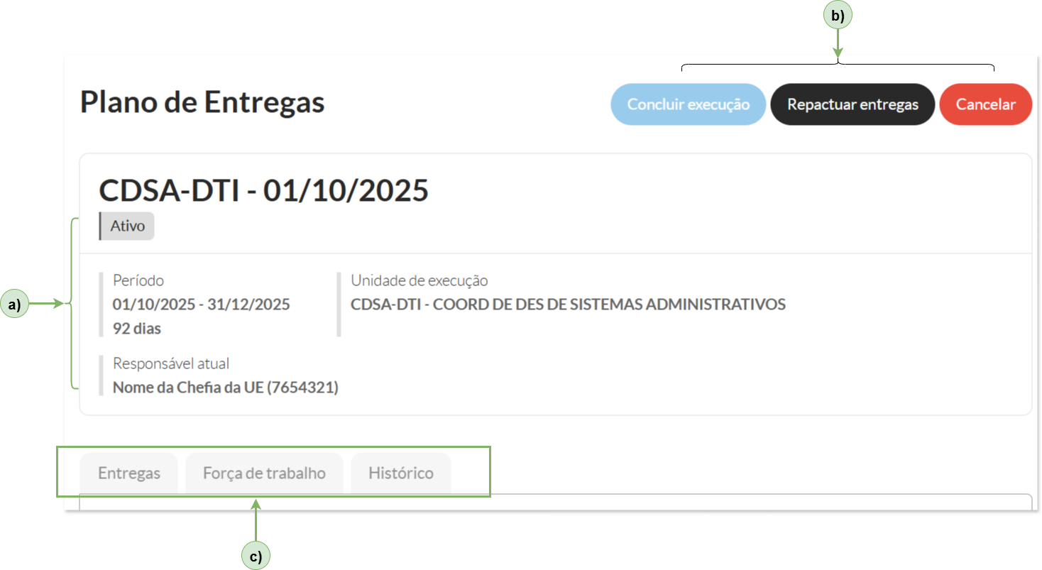 a) Informações Principais: Localizadas no topo da tela, exibem os dados essenciais do plano de entregas, como o período de vigência (data de início e término), unidade de execução e o responsável atual pela UE.