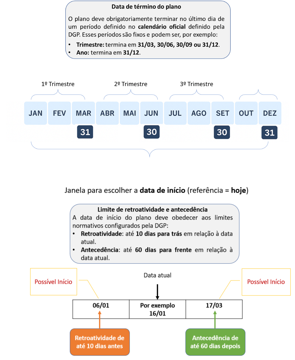 Embora o formulário de elaboração do Plano de Entregas seja simples, é imprescindível observar as seguintes exigências quanto às datas de início e término: