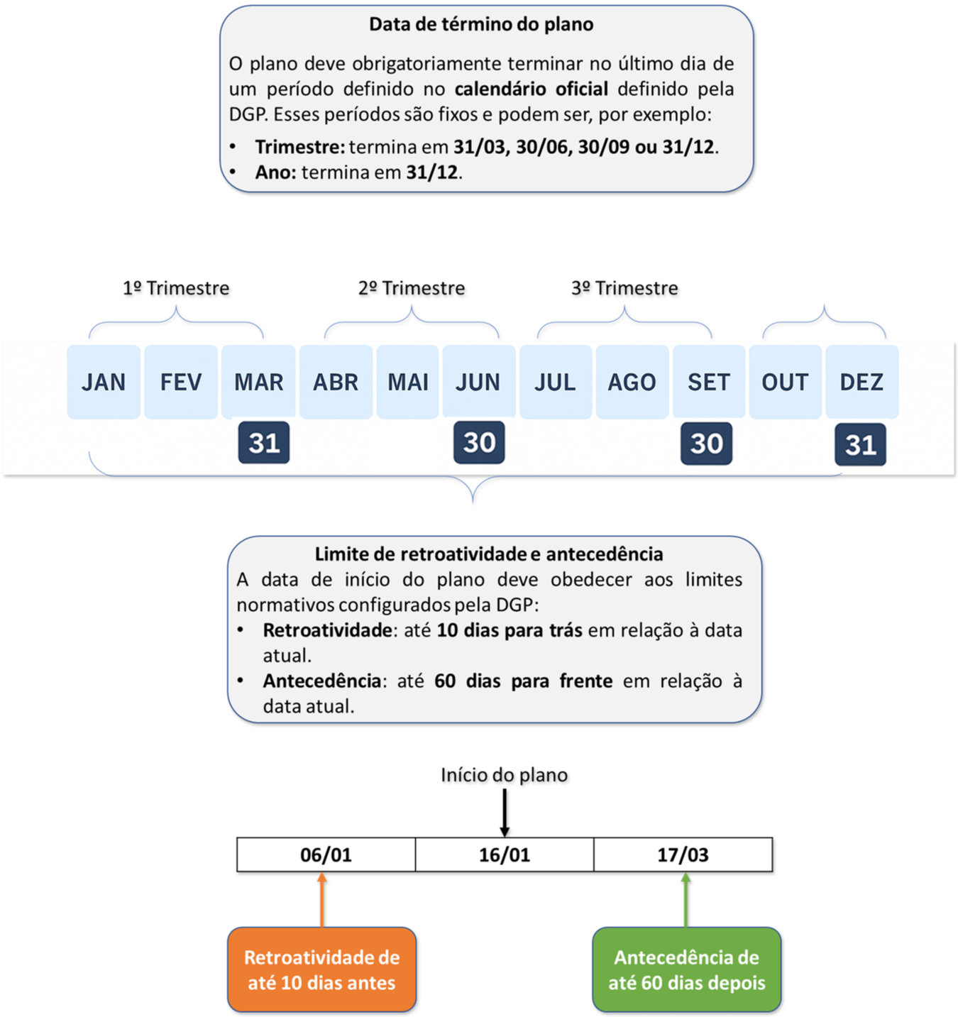 Vigência da adesão da Unidade Instituidora Descentralizada | O período do plano deve estar integralmente dentro do período para o qual a Unidade possui adesão vigente ao PGD. | Se a adesão do campus inicia em 01/03 → nenhuma unidade subordinada pode elaborar plano com início anterior a essa data (a menos que haja adesão anterior vigente). | É necessário verificar previamente a vigência da adesão antes de definir o período do plano. |