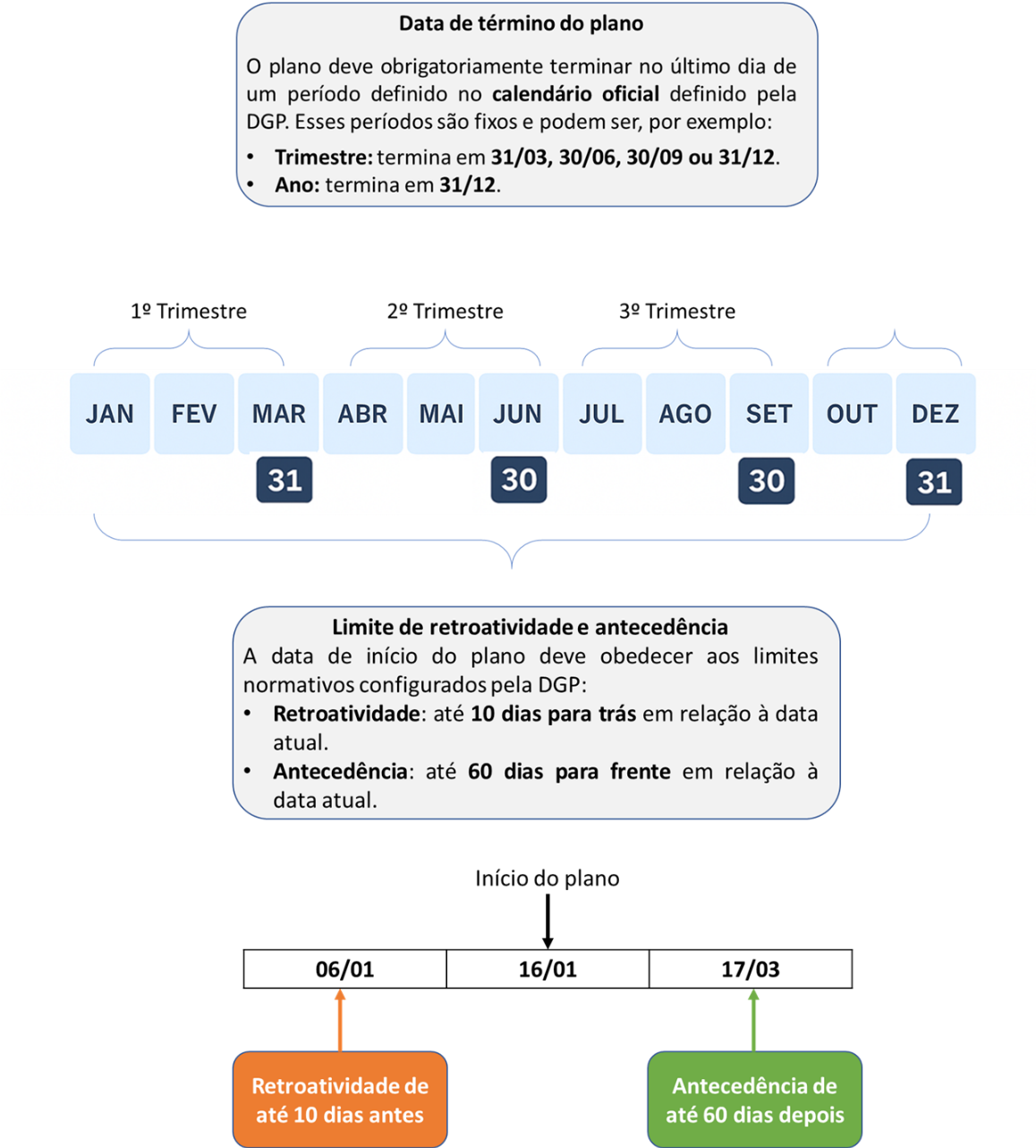 Embora o formulário de elaboração do Plano de Entregas seja simples, é imprescindível observar as seguintes exigências quanto às datas de início e término: