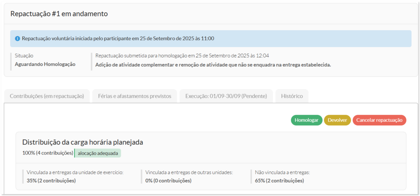 A repactuação é o processo pelo qual o participante pode ajustar as contribuições previamente homologadas em seu plano de trabalho. Ela consiste em um pacote de alterações que deve ser homologado integralmente pela chefia da Unidade Executora (UE), não sendo possível aprovar parcialmente.