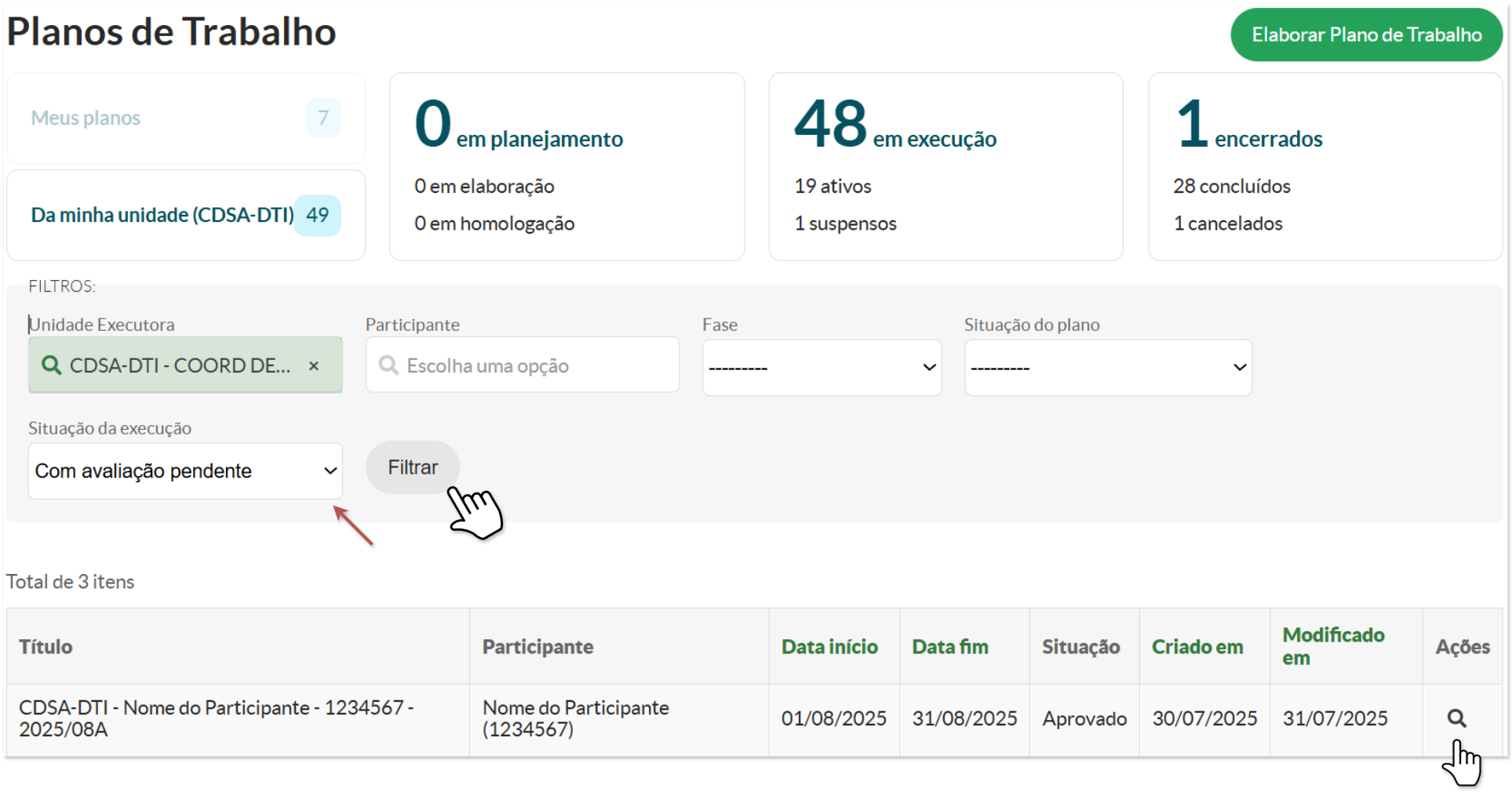 Todo o acesso aos planos cadastrados é feito por essa interface, onde é possível aplicar filtros por unidade, participante, fase, situação do plano e situação de execução. Na listagem, localize o plano que esteja com a situação de execução “Com Avaliação Pendente”, clique no ícone de lupa para abrir os detalhes e acesse a aba Execução.