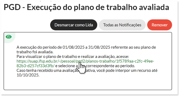Após avaliação, o participante será notificado automaticamente pelo sistema, tanto por e-mail quanto pelo ícone de notificação (sino) no SUAP. O acesso ao período avaliado pode ser feito clicando no link da notificação recebida.