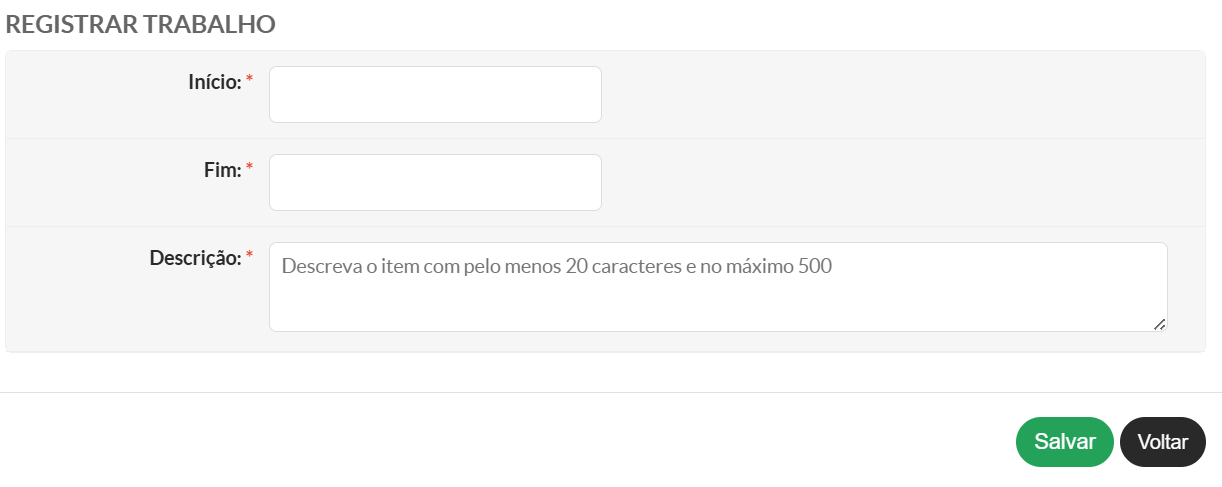 Os campos Início, Fim e Descrição são de preenchimento obrigatório, sendo que o campo Descrição deve conter no mínimo 20 (vinte) e no máximo 500 (quinhentos) caracteres.