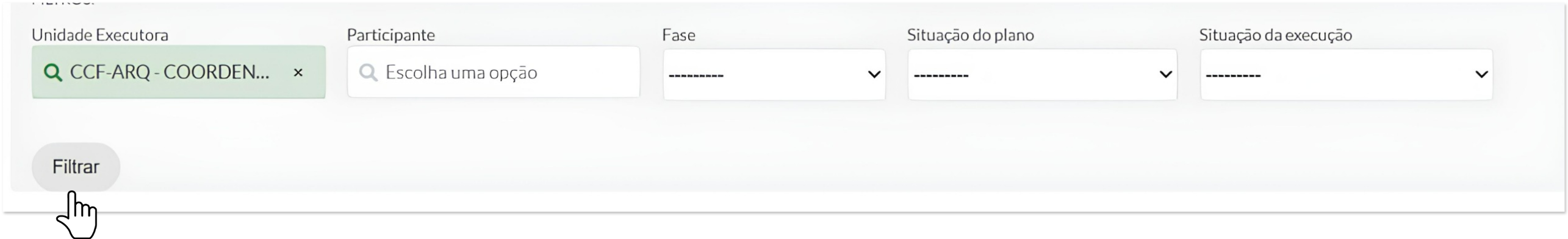 Após a seleção dos critérios desejados, clique no botão Filtrar para aplicar os filtros. Os resultados serão atualizados conforme os parâmetros definidos. Caso nenhum plano atenda aos critérios, será exibida a mensagem: “Nenhum plano de trabalho encontrado.”