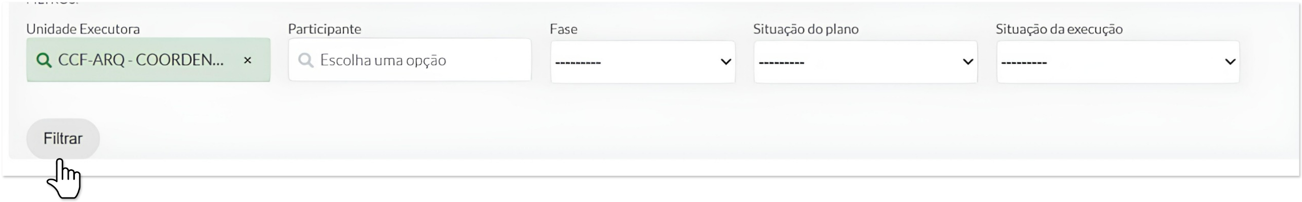 Após a seleção dos critérios desejados, clique no botão Filtrar para aplicar os filtros. Os resultados serão atualizados conforme os parâmetros definidos. Caso nenhum plano atenda aos critérios, será exibida a mensagem: “Nenhum plano de trabalho encontrado.”