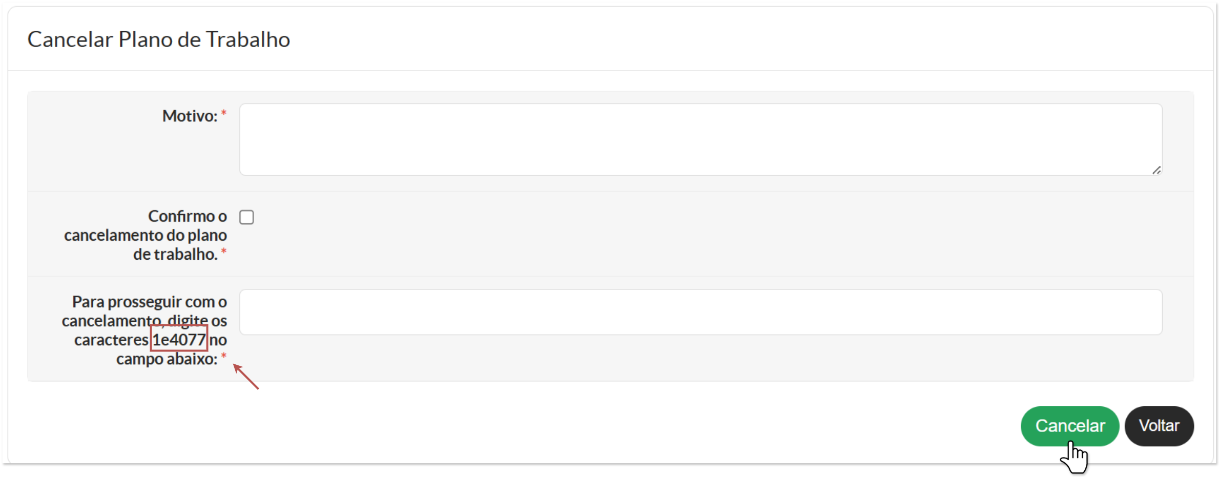 Confirmação | Marcar a caixa “Confirmo o cancelamento do plano de trabalho”. |
