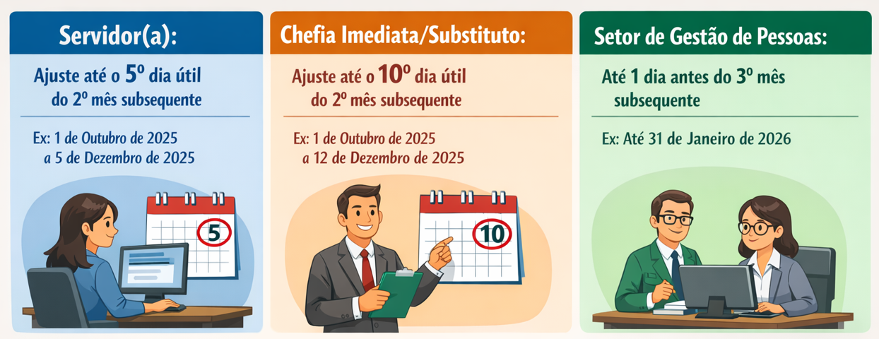 Por essa razão, todos os servidores, inclusive os que se encontram em PGD, recebem notificações mensais para verificar seus registros. Essa conferência pelos servidores é indispensável, em complemento à homologação realizada pela chefia imediata, para que eventuais divergências sejam identificadas e corrigidas dentro do prazo. Após o fechamento do período, o sistema bloqueia qualquer possibilidade de ajuste.