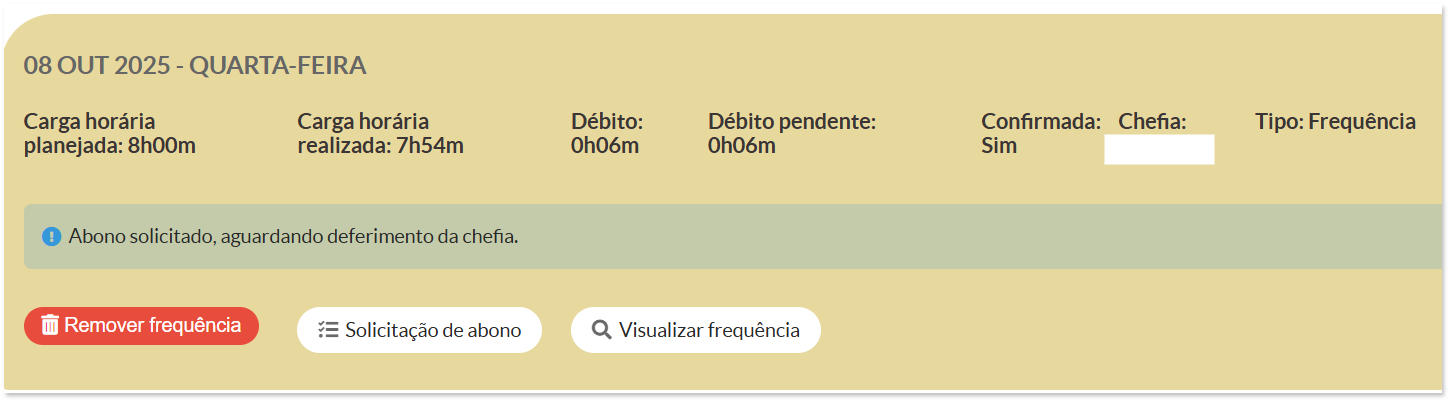 O débito permanecerá ativo até que a chefia aprove a solicitação. Após o deferimento, a informação de "Débito pendente" será atualizado para 0h00m, conforme ilustrado na imagem abaixo com exemplo de falta abonada.
